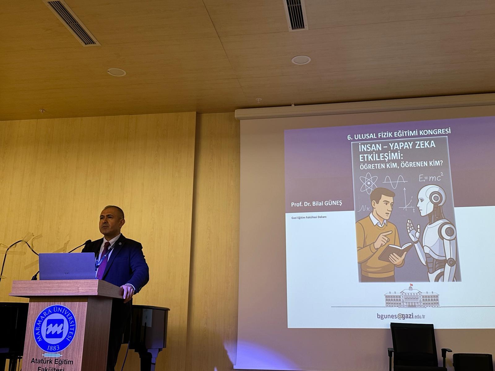 - Prof. Dr. Bilal Güneş (Gazi Üniversitesi): “İnsan–Yapay Zekâ Etkileşimi: Öğreten Kim, Öğrenen Kim?” başlıklı konuşmasında yapay zekânın öğretim süreçlerine etkisini çarpıcı örneklerle anlattı. Fizik eğitiminde dönüşen roller, zekâ kavrayışımızda paradigma değişiklikleri ve eğitim teknolojilerinin etik boyutları yoğun ilgi gördü.